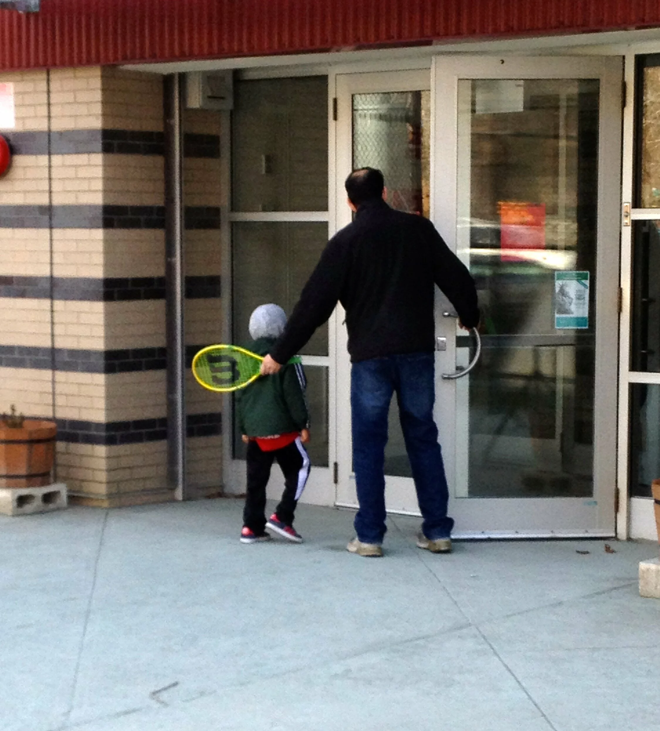 Dad and his little tennis ace, outside the Prospect Park Tennis Center.I see children everywhere, all of a sudden. I am staring at them, noticing how small they are standing next to their parents, the top of their heads barely reaching their dad's belt buckle or their mom's elbow.